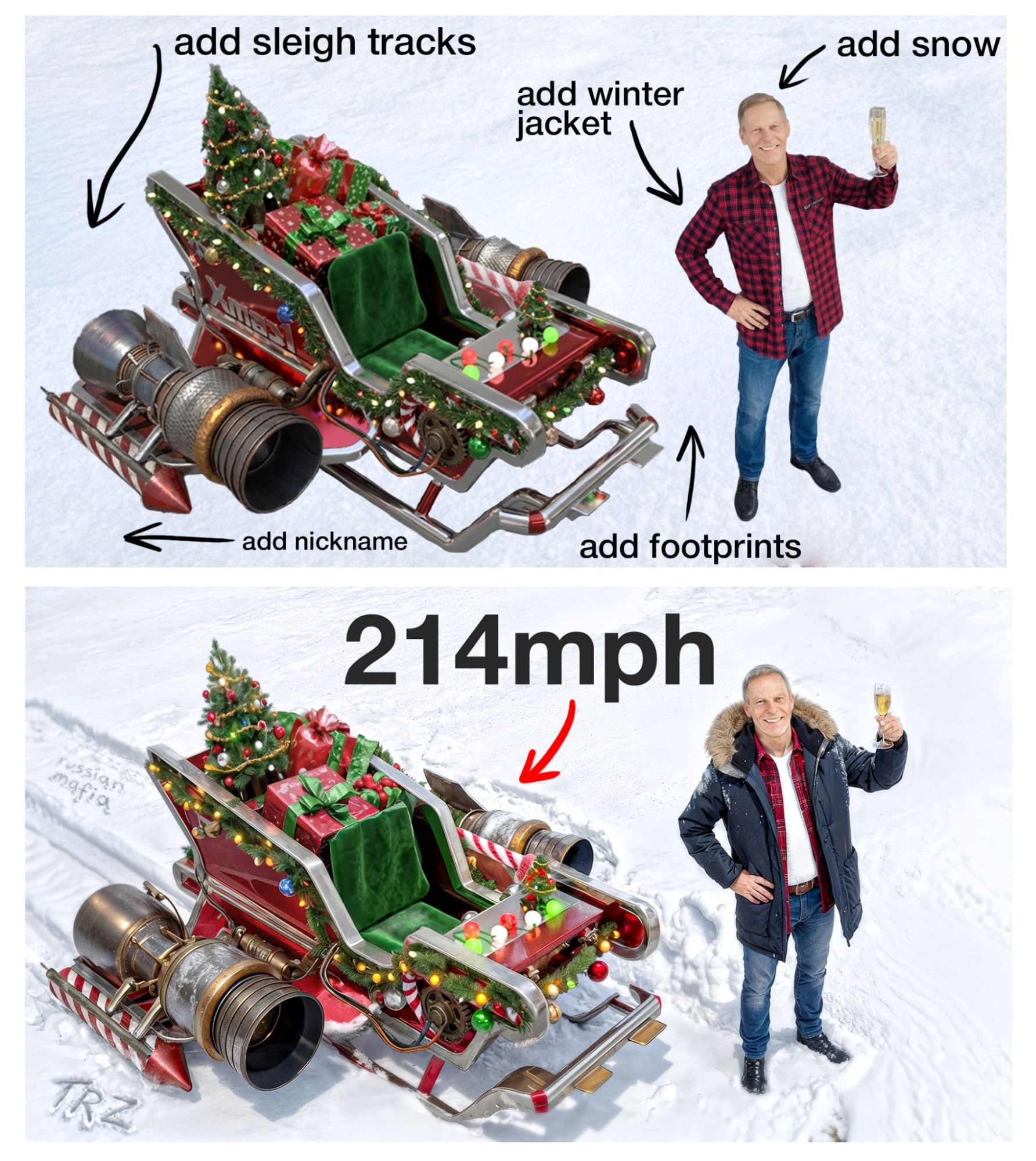 So I found a free model of this stylish sleigh on Sketchfab, then built a 3D pose using Magicposer.