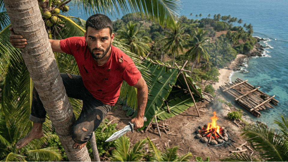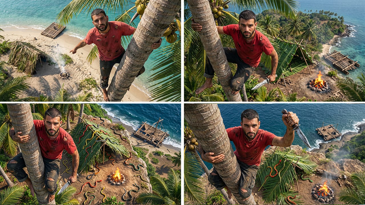 The video tells the story of how he ended up on a deserted island unprepared and survived there for three days. I wanted to find a more interesting angle, so it wouldn’t feel like just another thumbnail of a man on an island. The goal was to convey the scale of the island while also showing that Andrew had already settled in there. (I think that came across successfully.)